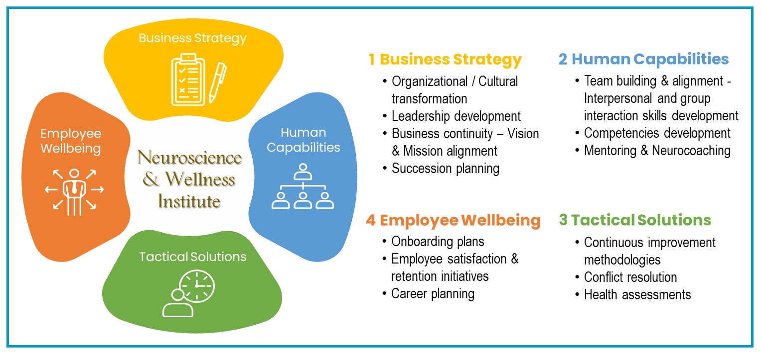 We are a neuroscience professional institution created to meet the current & evolving organizational development needs. As the human being evolves, the organizational needs change. New tools and skills will be required to promote health and continuity. We offer comprehensive programs to assist organizations on their transformation journey. Our team holds certifications in Neuro Coaching, Neuro Linguistic Programming, Mindfulness, Six Sigma, Continuous Process Improvement, Negotiation, and others. These methodologies are applied along all our programs that we offer.